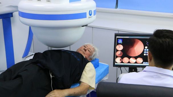 检查前的准备工作结束后,医生引导Frank穿上检查服,在控制台躺下,并吞下了胶囊。