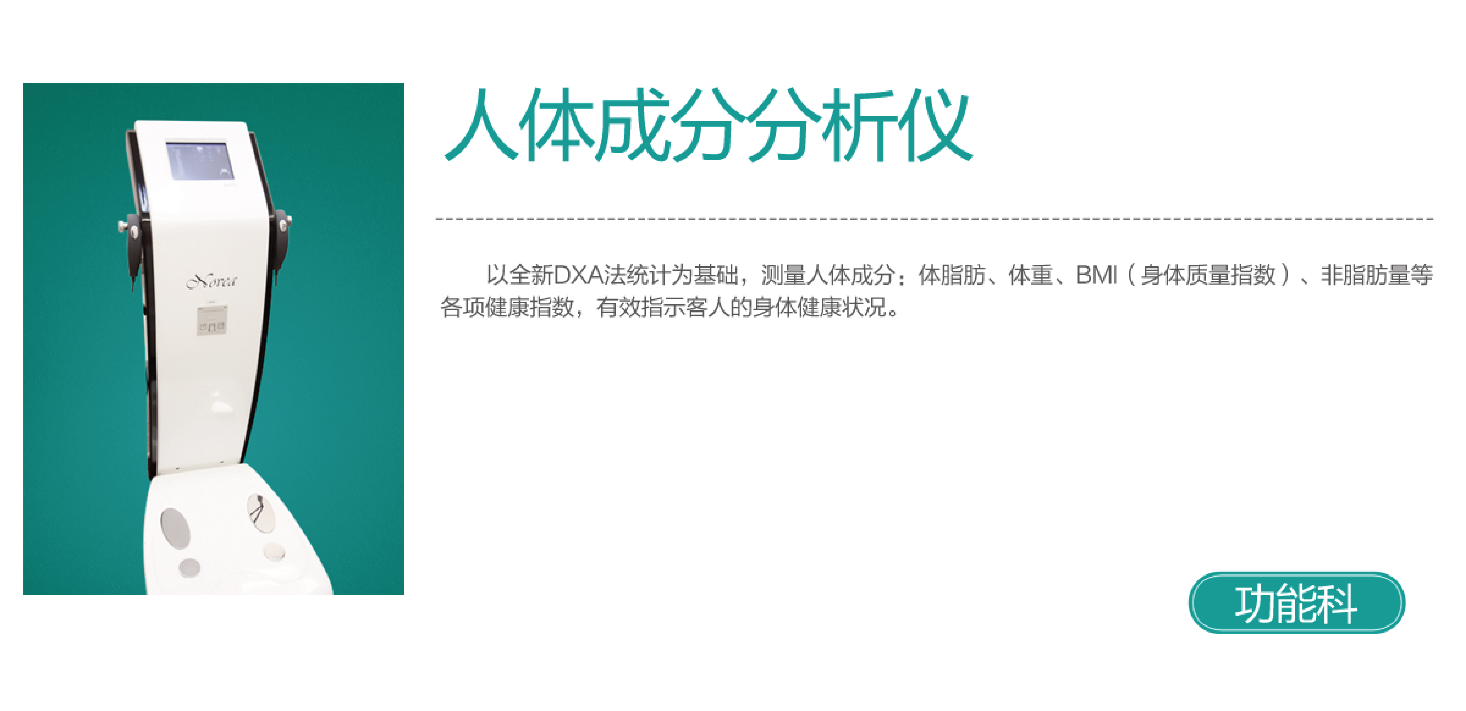 以全新DXA法统计为基础,测量人体成分:体脂肪、体重、BMI(身体质量指数)、非脂肪量等各项健康指数,有效指示客人的身体健康状况