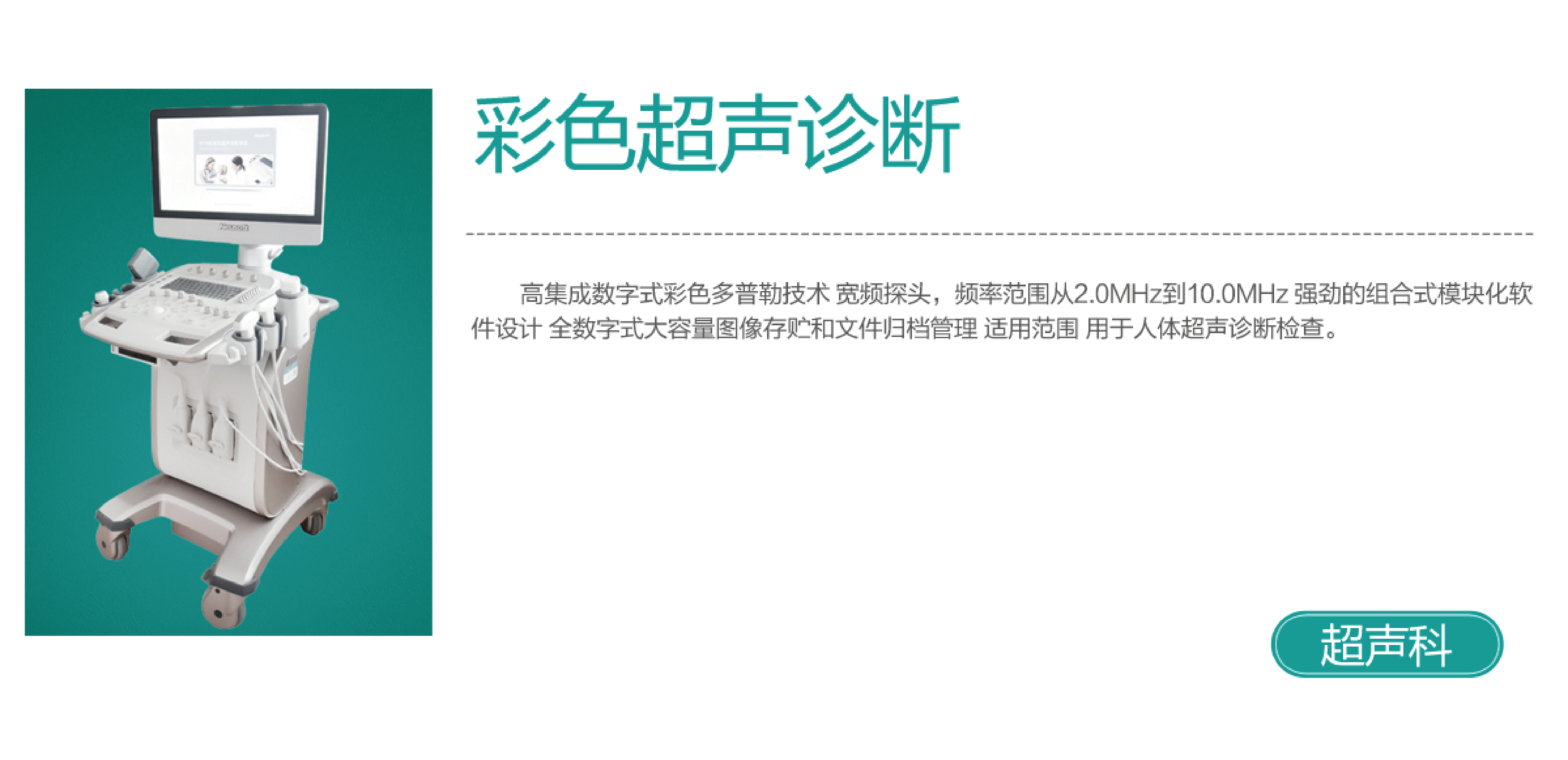 高集成数字式彩色多普勒技术 宽频探头,频率范围从2.0MHz到10.0MHz 强劲的组合式模块化软件设计 全数字式大容量图像存贮和文件归档管理 适用范围 用于人体超声诊断检查。