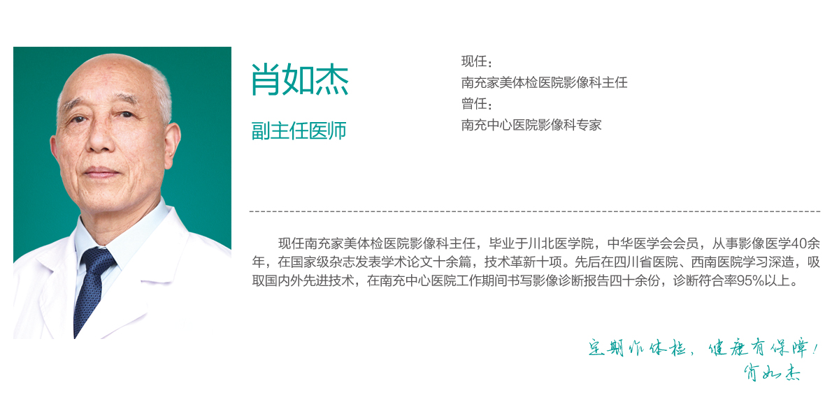 现任南充家美体检医院影像科主任,毕业于川北医学院,中华医学会会员,从事影像医学40余年,在国家级杂志发表学术论文十余篇,技术革新十项。先后在四川省医院、西南医院学习深造,吸取国内外先进技术,在南充中心医院工作期间书写影像诊断报告四十余份,诊断符合率95%以上。